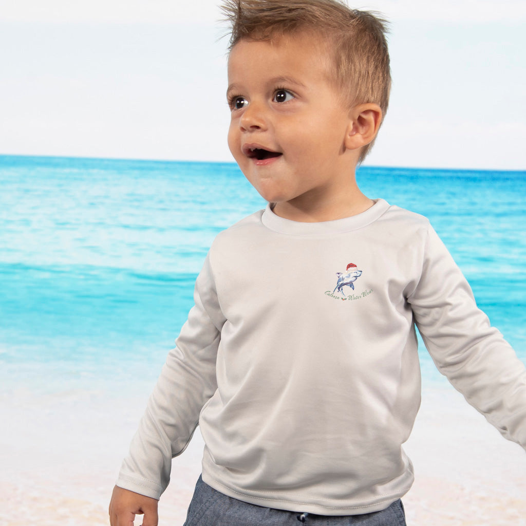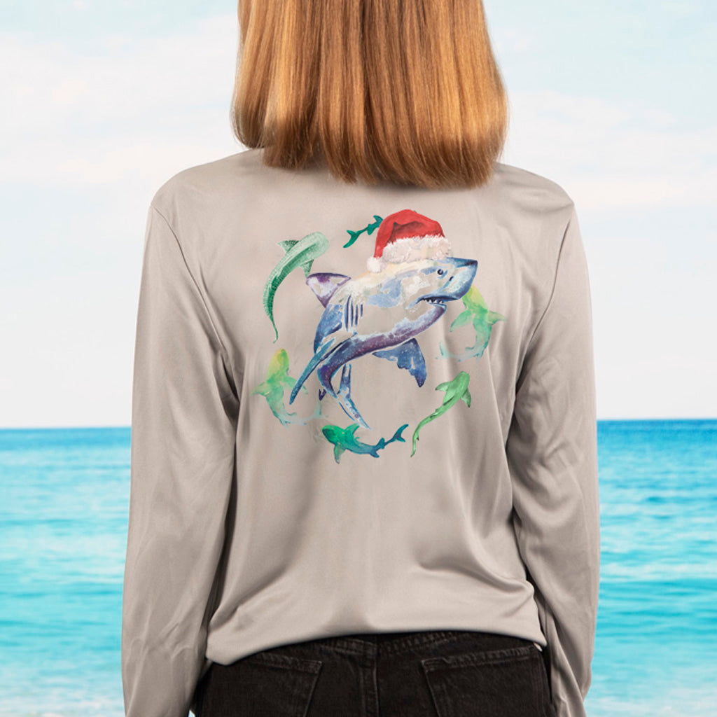 We will have a Great White Christmas this year...but not the kind with snow. Our Great White Christmas design features a circling wreath of green sharks in the background with a festive Great White swimming to the front and is printed on our silver UPF 50 sun protective Ultra Comfort Shirt. This shirt makes a great gift for shark fans of all ages. Available in both toddler and kids sizes.