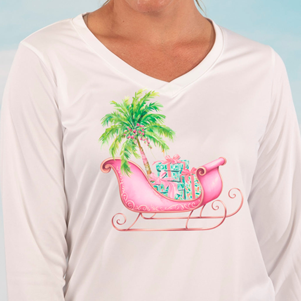It's time to decorate your Palm Trees, because Santa is coming in a Coastal Christmas Sleigh this year. Printed on our white v-neck long sleeve Ultra Comfort performance shirt, it has natural UPF 50 sun protection and will keep you cool and comfortable all day long with it's wicking and quick dry qualities.