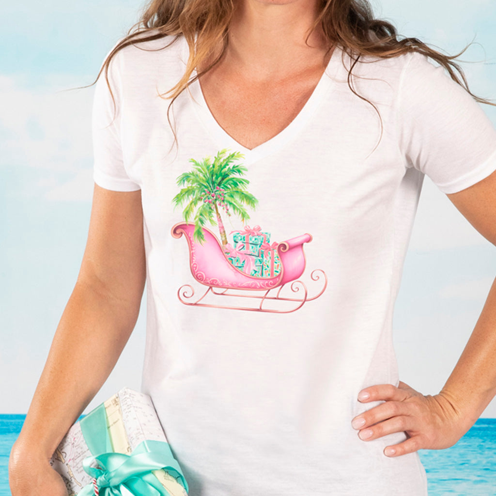 It's time to decorate your Palm Trees, because Santa is coming in a Coastal Christmas Sleigh this year. Printed on our soft blend fashion v-neck t-shirt and will surly keep you in the holiday spirit all season long.