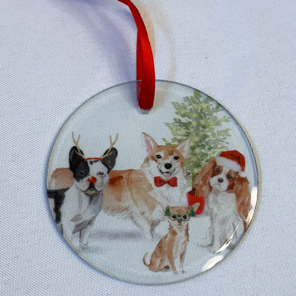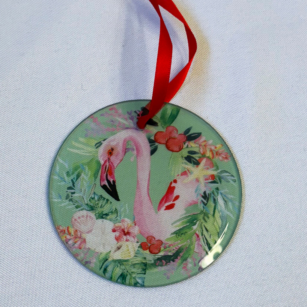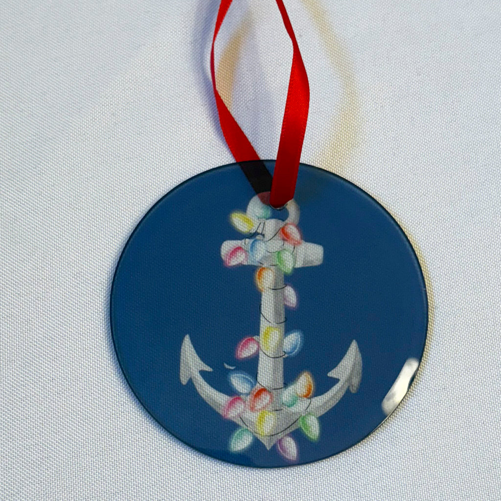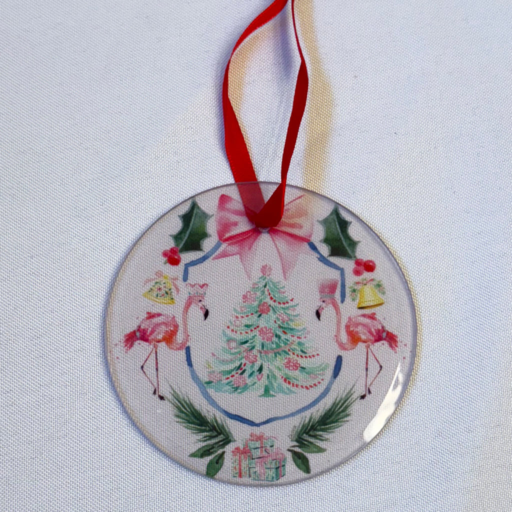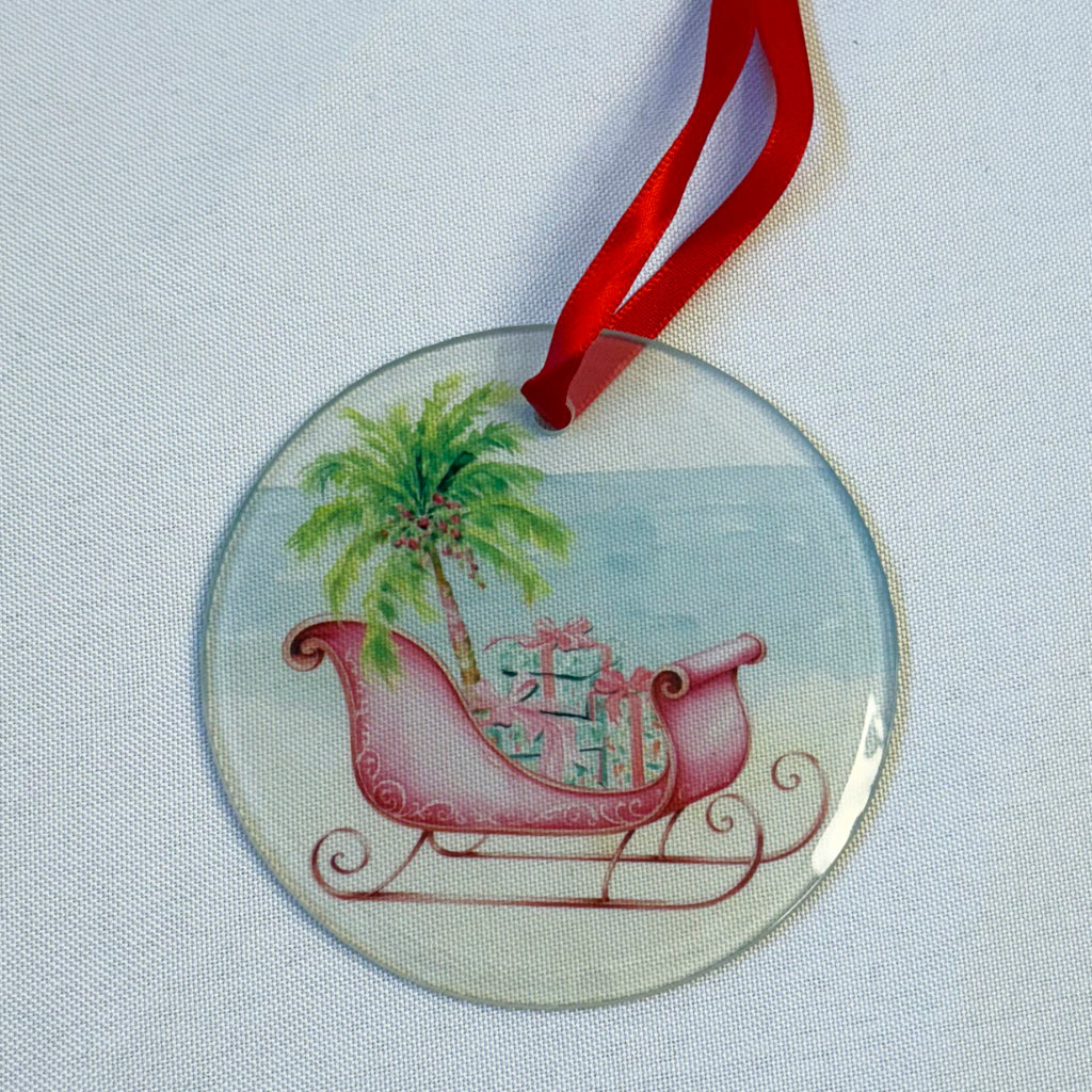 The ornaments are 3.5 inches in diameter and are made of clear glass with a beveled edge. All ornaments arrive with a red satin ribbon for hanging. They are a perfect addition to your coastal holiday celebrations.