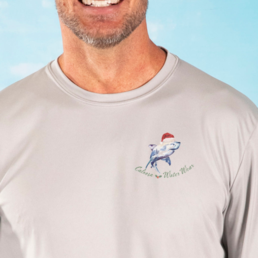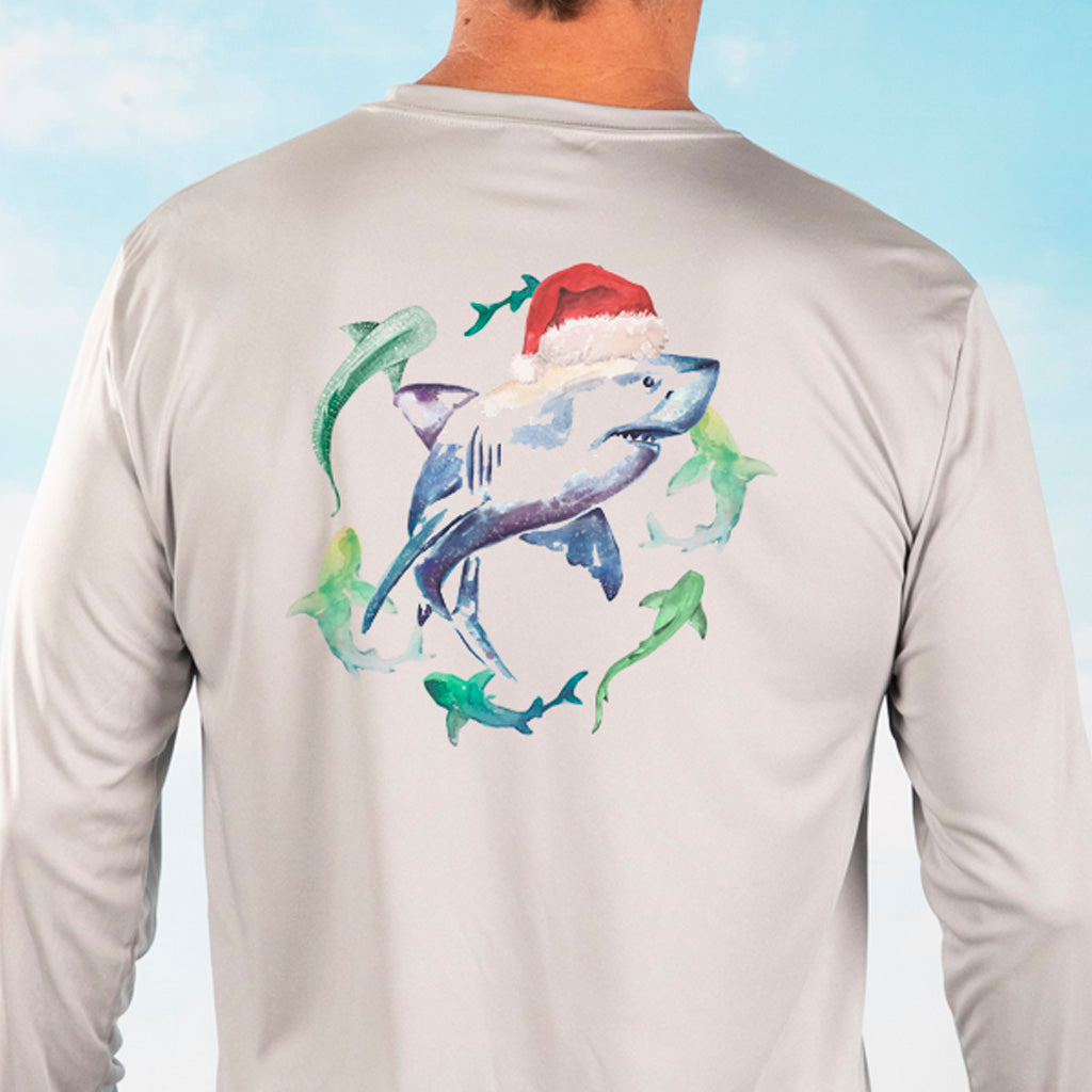 We will have a Great White Christmas this year...but not the kind with snow. Our Great White Christmas design features a circling wreath of green sharks in the background with a festive Great White swimming to the front and is printed on our silver UPF 50 sun protective Ultra Comfort Shirt. This shirt makes a great gift for shark fans of all ages.