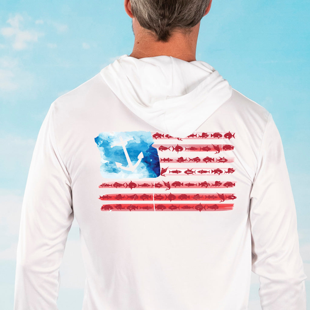 Show Your Love for America and for Fishing at the same time with Caloosa's new Hooded American Fish Ultra Comfort Shirt. This shirt is sun protective so it will allow you to focus on catching the next big fish instead of applying sunscreen.