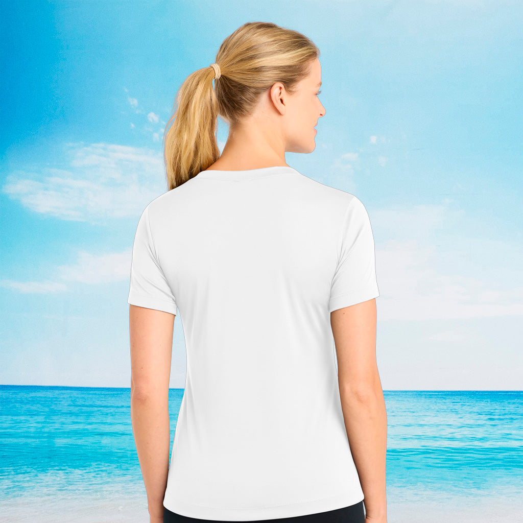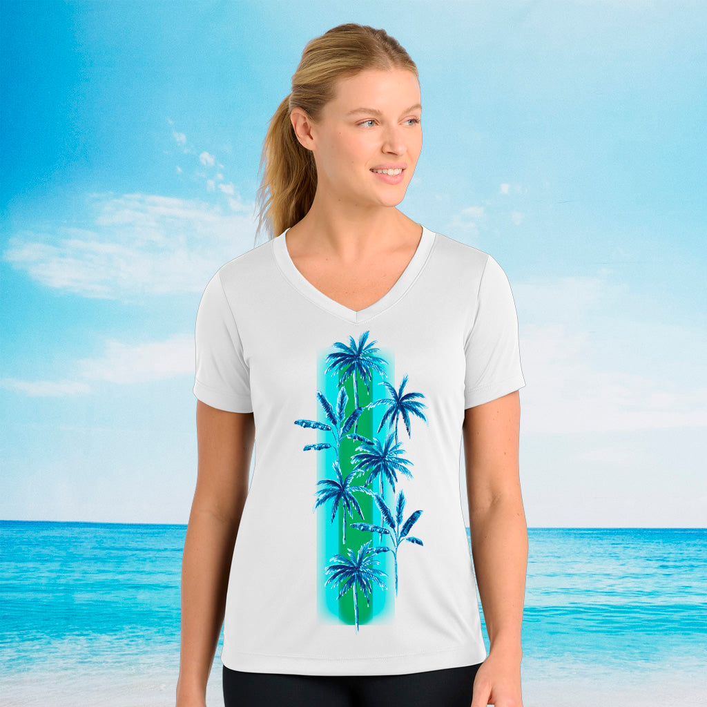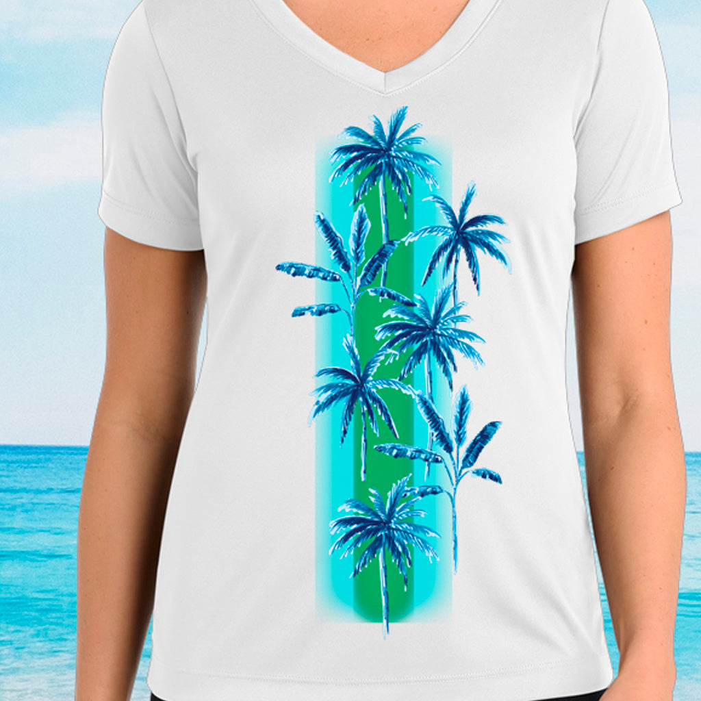 Step into Paradise with our sporty Blue Palm Stripe short sleeve Ultra Comfort Shirt. This preppy design can't help but to make you happy and keep you comfortable at the same time. Printed on our white v-neck Ultra Comfort short sleeve shirt, this top offers wicking, quick dry and UPF 50 sun protection.
