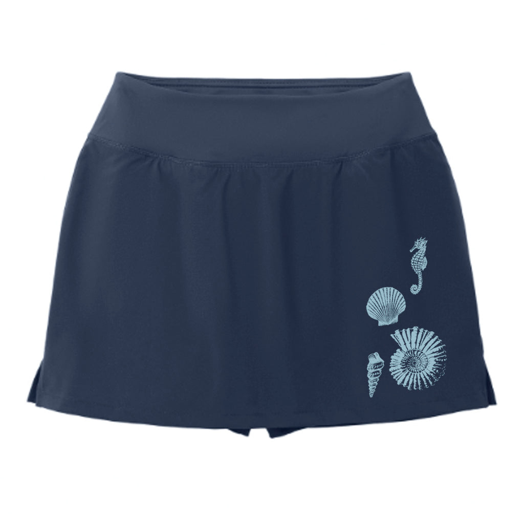 Go the distance on your next beach walk with our must have skort in True Navy featuring shell designs placed on the left side.  This skort offers moisture wicking, snag resistance and a great fit.