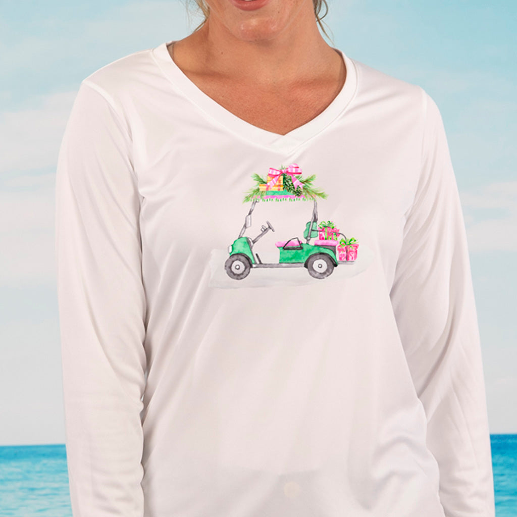 Hit the links and deliver good cheer in our Christmas Golf Cart t-shirt. Printed on our white v-neck long sleeve Ultra Comfort performance shirt, it has natural UPF 50 sun protection and will keep you cool and comfortable all day long with it's wicking and quick dry qualities.